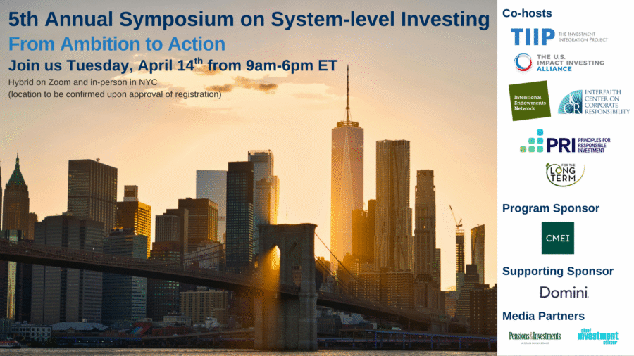 The 5th Annual Symposium on System-Level Investing convenes asset owners, asset managers, fiduciaries, foundations, and field-builders to confront this implementation gap. Co-hosted by The Investment Integration Project (TIIP), the U.S. Impact Investing Alliance (USIIA), the Intentional Endowments Network (IEN), the Interfaith Center on Corporate Accountability (ICCR), the Principles for Responsible Investment (PRI) and For the Long Term (FTLT) and sponsored by the Center for Monitored and Ethical Investment (CMEI) and Domini Impact Investments, the Symposium focuses squarely on what it takes to operate as a system-level investor in practice.